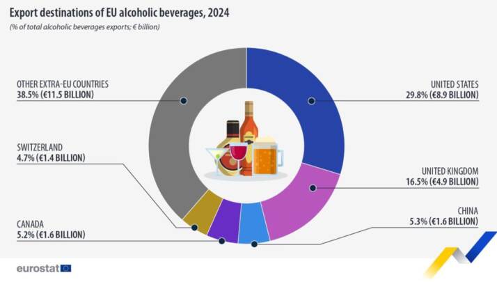 L’ufficio statistico dell’Ue certifica poi che gli Stati Uniti si confermano la principale destinazione delle bevande alcoliche europee, con importazioni per un totale di 8,9 miliardi di euro, pari al 30% del totale. Oltre la metà di questo valore, 4,9 miliardi, è legato al vino, e altri 2,9 miliardi a distillati e liquori. Il Regno Unito è il secondo partner commerciale dell’Ue, con 4,9 miliardi di euro (il 17% del totale), principalmente legato alle esportazioni di vino (68%, pari a 3,3 miliardi di euro). Seguono Cina e Canada (1,6 miliardi ciascuno) e Svizzera (1,4 miliardi).
