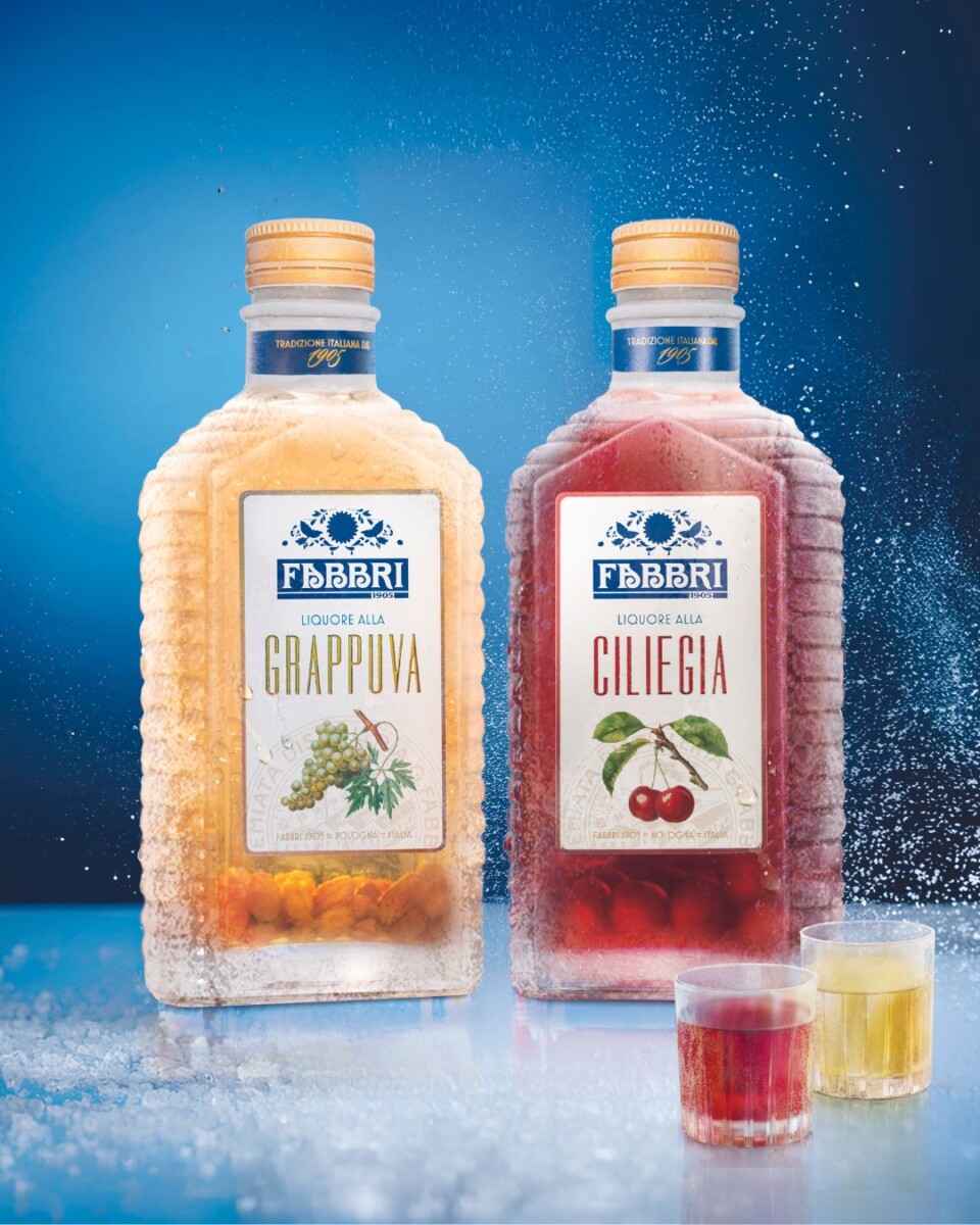 Da questa nuova visione nascono il Liquore alla Ciliegia e il Liquore alla Grappuva, evoluzione da bere dei due best seller – le Ciliegie al liquore e la Grappuva – di cui Fabbri 1905 è incontrastato leader di mercato. Due referenze originali e uniche sia nel gusto sia nella vista: i frutti sono infatti presenti anche sul fondo delle bottiglie, impreziosendo ulteriormente una veste elegante. La bottiglia è infatti una rivisitazione dell’originale realizzata negli anni ’30 dalla Premiata Distilleria Fabbri.