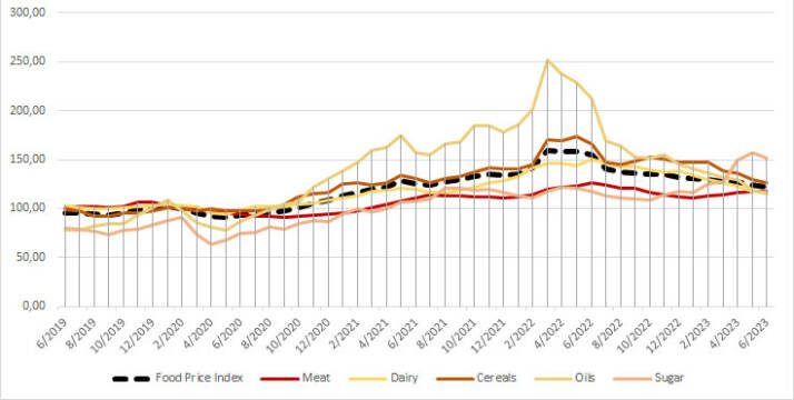 L’indice dei prezzi alimentari della FAO, che monitora le variazioni mensili dei prezzi internazionali delle principali materie prime alimentari scambiate, è stato in media di 122,3 punti a giugno, in calo del 1,4% rispetto a maggio e del 23,4% rispetto al suo picco nel marzo 2022.