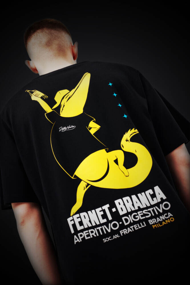 I capi sono poi impreziositi da dettagli ricchi di significato: numeri simbolici come 1845, anno di fondazione di Fernet-Branca, e 1989, anno di nascita dei fondatori di Dolly Noire; la scritta “Milano” per celebrare l’origine dei due iconici marchi, e gli iconici claim “27 erbe tutte legali” e “Attenzione alle imitazioni” che richiamano la storica unicità dell’amaro; i simboli identitari di entrambi i brand, tra cui il rombo e l’ariete di Dolly Noire, l’aquila e il globo di Fernet-Branca.