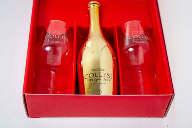 Magia di Collesi è una sorpresa per il palato ma anche per gli occhi, nella sua speciale bottiglia dorata, proposta anche nello speciale cofanetto-regalo con due calici.