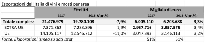 Il vino italiano nel 2018 è cresciuto del 3,3% in valore toccando i 6,2 miliardi di euro, mentre a volume, a causa della scarsa vendemmia del 2017 e una domanda piuttosto fiacca sui mercati, è sceso sotto la soglia dei 20 milioni di ettolitri (19,8 milioni hl), pari a circa l’8% in meno rispetto all’anno precedente.