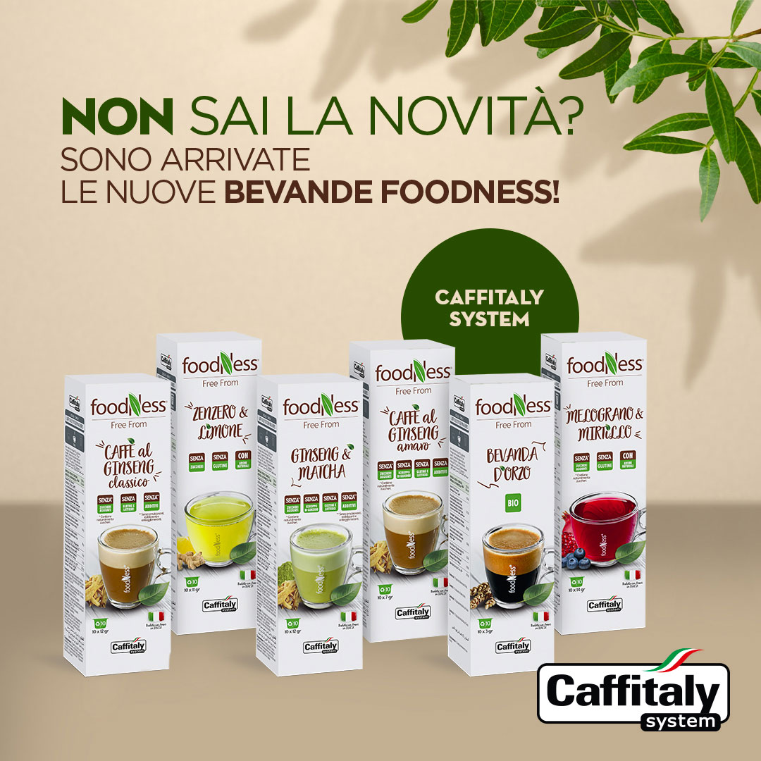 Caffè al Ginseng Classico, Caffè al Ginseng Amaro, Ginseng & Matcha, Bevanda d’Orzo Bio, e le tisane gusto Zenzero & Limone e Melograno & Mirtillo: queste le sei bevande Foodness protagoniste della collaborazione – già disponibili sull’e-commerce di Caffitaly, negli oltre 100 monomarca e nella rete di oltre 1.000 negozi multimarca specializzati su tutto il territorio italiano -, che vanno ora ad affiancarsi ai caffè (a marchio Caffitaly e dei torrefattori partner Caffè Cagliari, Chicco d’Oro, Kimbo), ai caffè aromatizzati e alle altre bevande calde (a marchio Caffitaly e dei partner Ricola e Twinings) della vasta proposta di Caffitaly.