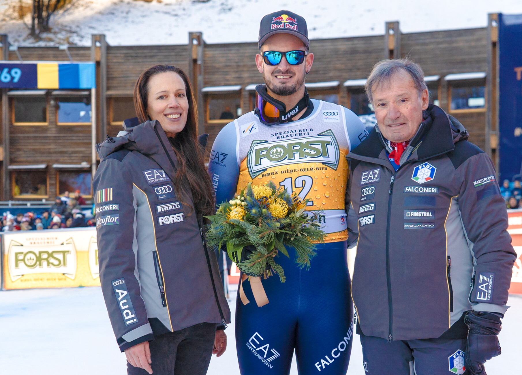 L’evento memorabile è stato immortalato da una foto dopo la premiazione, la quale ritrae Dominik Paris insieme a Cellina von Mannstein di Birra FORST e Flavio Roda, Presidente FISI, senza dubbio un trio vincente, presente alla premiazione ufficiale.