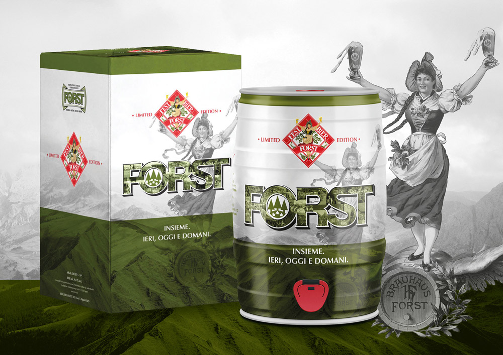 Grazie al consueto stile e colore verde FORST, il packaging del fustino da 5 litri trasferisce positività, mentre all’interno del logo di Birra FORST si riflettono immagini dei tradizionali eventi sostenuti da FORST nel passato e nel presente. Nata tra le montagne dell’Alto Adige e con profonde radici nel territorio, la tradizionale “Bierliesl” rappresentata nello sfondo, è sinonimo di piacere e di festa.