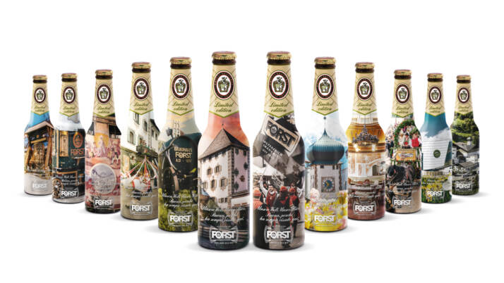 Una selezione di immagini degli edifici storici e di quelli moderni e dei posti più affascinanti della sede di Birra FORST, del paesaggio, della vita, delle tradizioni e dei costumi, decorano le bottiglie di birra personalizzate. L’annuale Foresta Natalizia di Birra FORST con il suo simbolo, la campana della pace di FORST e le magnifiche carrozze sono alcuni dei protagonisti dell’edizione limitata di quest’anno.