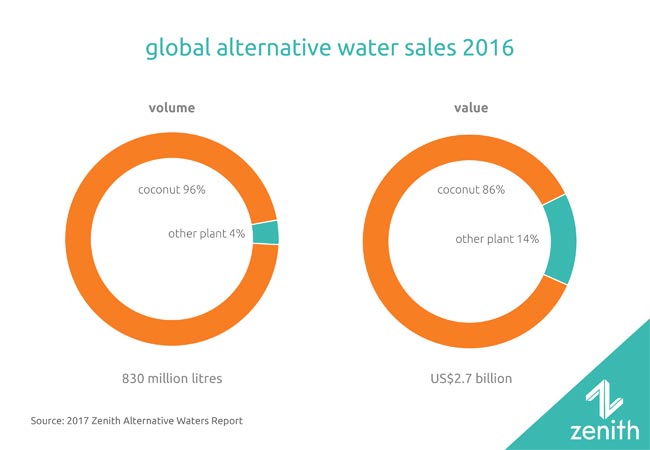 Zenith prevede che il mercato globale delle acque vegetali si avvicinerà a 1.900 milioni di litri nel 2020, beneficiando di aumenti nelle vendite in entrambi i mercati tradizionali e di alta qualità. Le principali opportunità per le marche presenti sul mercato di queste acque alternative comprendono la fornitura di alta qualità, la produzione artigianale, il biologico e i prodotti ‘non da concentrato’. Nel report 2017 “Global Alternative Waters Report”di Zenith Global troviamo un focus di approfondimento su acqua di cocco, acqua d’acero e acqua di betulla, con volume e valore previsionali fino al 2020, così come più di 40 profili dettagliati dei prodotti.