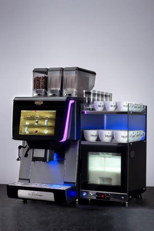 La Radiosa, la prima macchina professionale superautomatica a marchio Gaggia Milano, si distingue per elettronica avanzata, connessione integrata e tecnologia EvoMilk, un nuovissimo sistema di erogazione di latte fresco che consente sia di erogare bevande a base di latte caldo e freddo perfettamente montato, sia di preimpostare le dosi, la temperatura e la densità del latte fresco per ottenere sempre eccellenza e qualità delle bevande erogate. Lo stile inconfondibile del marchio Gaggia Milano, inoltre, è esaltato da un touchscreen da 10’’ in cui è possibile personalizzare le icone delle selezioni, regolare il colore dei profili led RGB, creando le combinazioni preferite e molto altro ancora.
