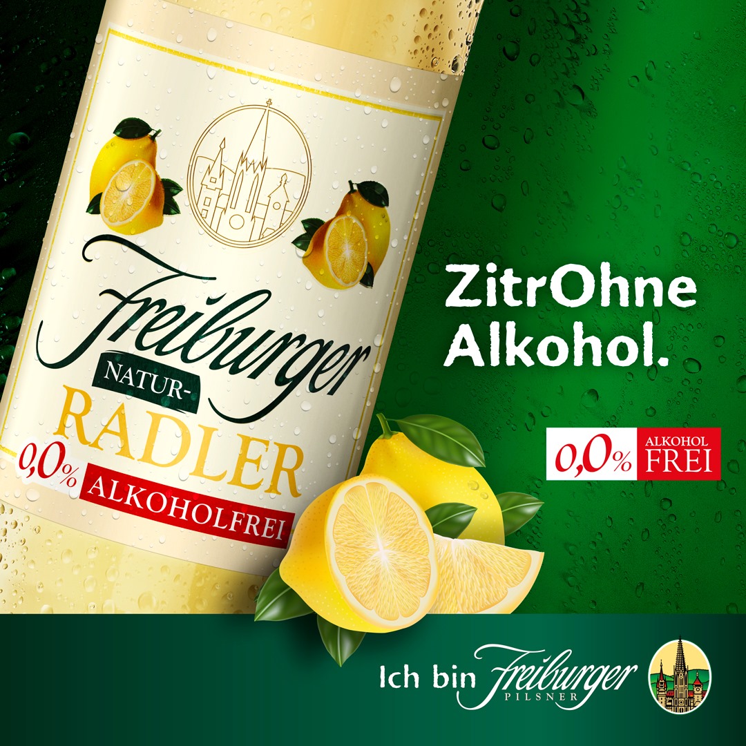 La frizzante e rinfrescante radler naturale analcolica di Friburgo, composta al 60% di limonata naturalmente torbida e al 40% di birra analcolica, è adatta a tutti coloro che vogliono godersi una bevanda naturale in viaggio, dopo lo sport, tra e durante il giorno . La 0,0% senza alcool Freiburger Natur-Radler è ora disponibile in casse da 24 x 0,33 l.