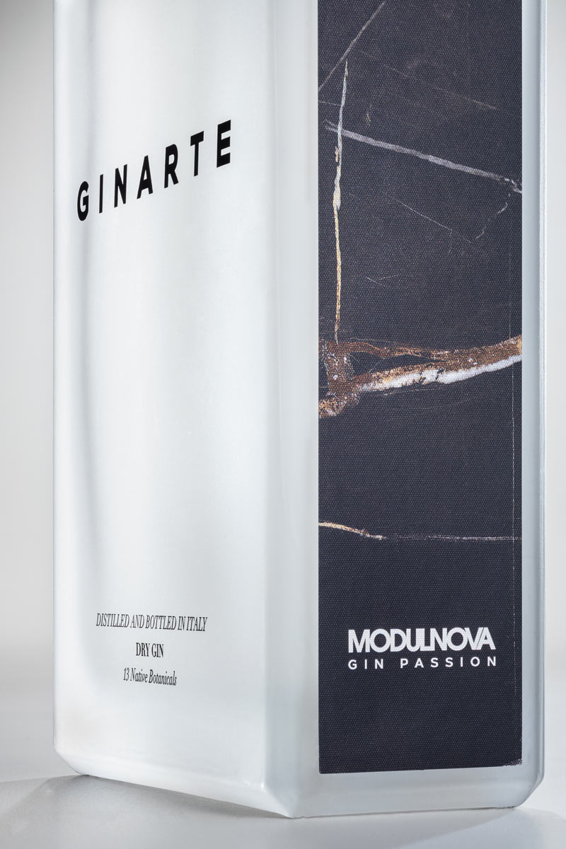 La speciale bottiglia Ginarte per Mudulnova racchiude il blend di botaniche selezionate da Ginarte (ginepro toscano, nepitella, cartamo, robbia, reseda odorosa, guado di Montefeltro, angelica, lavanda, ibisco, sambuco, germogli di pino, pino mugo e aghi di pino).