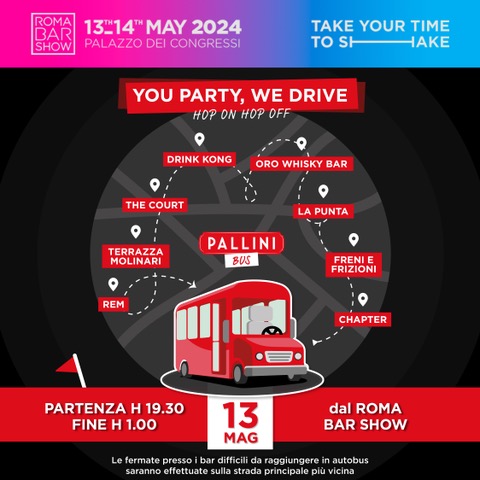 Ma il clou della prima giornata di lunedì 13 maggio sarà “You Party, We Drive”, ovvero il bus officiale di Roma Bar Show brandizzato Pallini / Ginarte con la Guest Shift di Julian Biondi. Dalle 19.30 all’1.00 il percorso a ciclo continuo del bus effettuerà otto fermate presso altrettanti Side show (Chapter, Freni e Frizioni, La Punta, Oro Whishy Bar, Drink Kong, The Court, Terrazza Molinari e Rem) per un vero e proprio “Hop On Hop Off” presso il meglio del mondo mixology della Capitale. Ma lo show sarà anche a bordo con una Drink List Ginarte che proporrà alcuni inediti come il TipoNegroni (Ginarte Dry Gin, Amante 1530, Bitterone Pallini) e l’Italian Paloma (Ginarte Dry Gin, Ron Colon High Proof, lime, Angostura, Galvanina Ginger Beer).