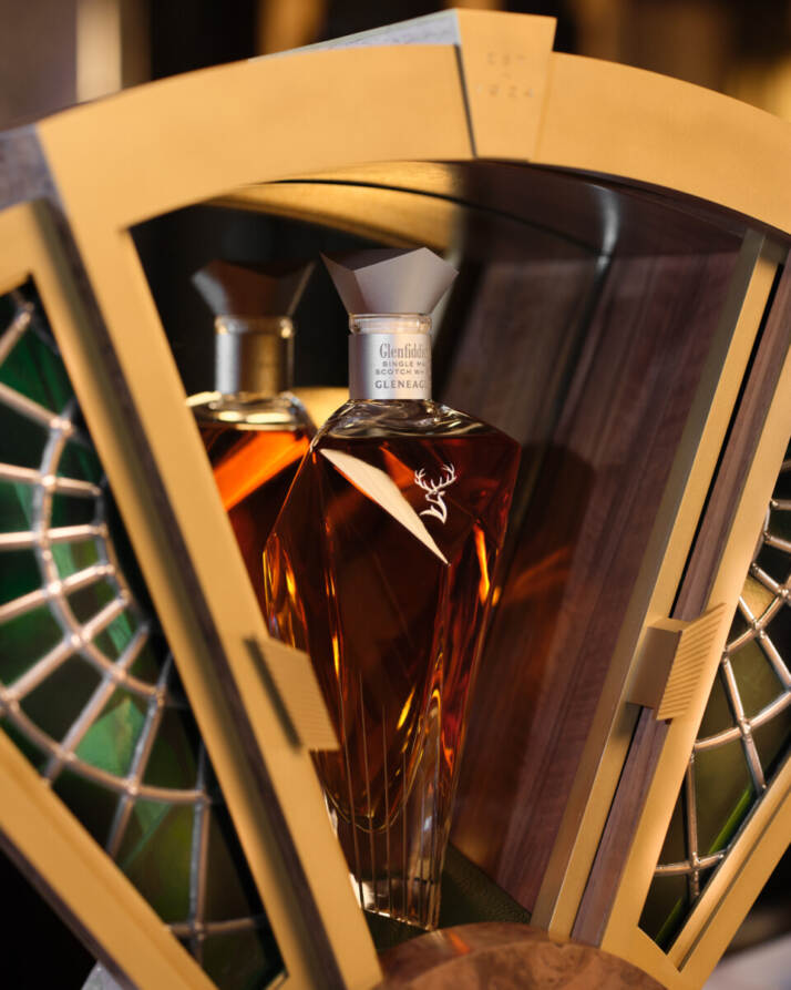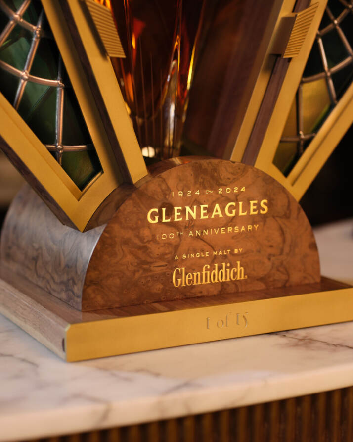 Il Gleneagles x Glenfiddich Centenary Reserve è presentato in una straordinaria teca, realizzata a mano dall’artista di Glasgow John Galvin. La teca si ispira allo stile decorativo originale di Gleneagles e ai vagoni ferroviari vintage, utilizzando noce burr lucidato e vetro colorato su misura per racchiudere la bottiglia. L’elegante custodia rivela una bottiglia spettacolare che riporta in vita le articolazioni dell’epoca d’oro dello spirito ferroviario, del viaggio di lusso e della fondazione di due icone scozzesi.