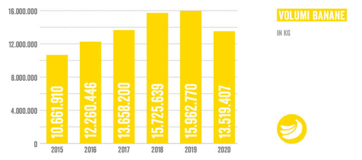 Le banane restano il primo prodotto per volumi. Dopo una crescita sempre costante negli ultimi 15 anni in termini di volumi, per la prima volta il 2020 ha registrato un -15% pari a 13.500 tonnellate di venduto. Le perdite registrate nel fuori casa non sono state controbilanciate dall’aumento delle vendite nel canale retail. Le prime proiezioni sul 2021 fanno comunque già sperare per l’anno in corso ad un ritorno ai valori pre-crisi.