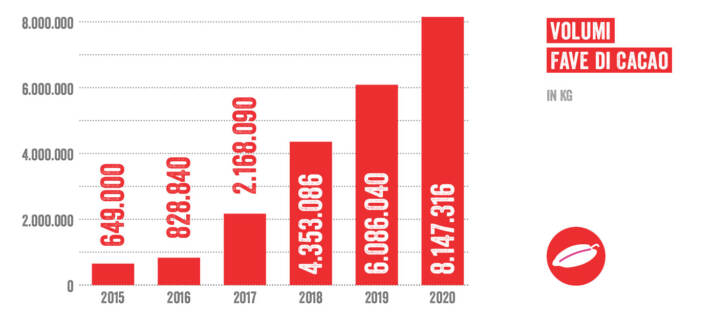 Il boom del cacao. Il 2020 ha visto una importante scesa in campo da parte di alcune catena della grande distribuzione a favore delle filiere del cacao. Il Marchio di Ingrediente Fairtrade, creato allo scopo di aumentare i volumi di materia prima venduta in origine per generare un maggiore impatto sugli agricoltori, ha permesso alle aziende di ampliare la gamma di prodotti certificati, e in modo particolare i discount hanno esteso l’utilizzo del marchio a decine di referenze. Complessivamente sono state vendute 8.000 tonnellate di fave di cacao a condizioni Fairtrade (+33%).