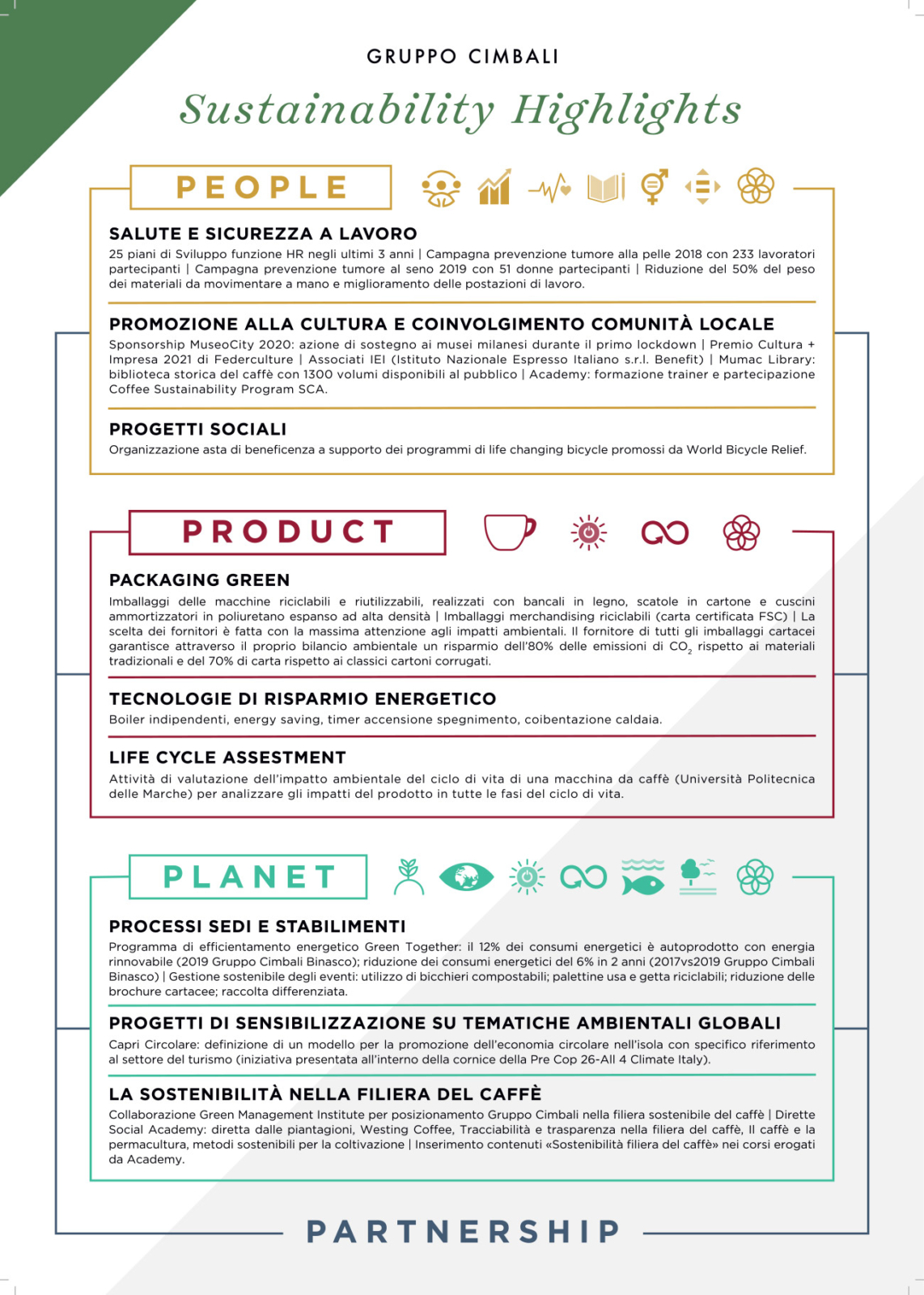 In linea con gli obiettivi dell’Agenda ONU 2030, Gruppo Cimbali ha così messo a punto un Manifesto della Sostenibilità che evidenzia le 4 principali aree di intervento (People, Product, Planet e Partnership) e riassume le principali iniziative di sostenibilità: dalla salute e sicurezza dei lavoratori all’impegno per la riduzione degli sprechi, dall’utilizzo di materiali riciclabili all’applicazione di tecnologie per il risparmio energetico all’efficientamento dei processi produttivi fino alla collaborazione costante con altre realtà per il raggiungimento degli obiettivi comuni.