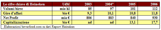 Un 2006 in buona progressione per il gruppo olandese che registra un incremento di fatturato di quasi il 10%, portandosi a 11,8 miliardi di euro. I volumi di vendita delle birre sono stati di 112 milioni di ettolitri (+ 11%). Anche il profitto netto è aumentato dell’11% portandosi a 930 milioni di euro. Jean-François van Boxmeer, CEO del gruppo, ha dichiarato “Il 2006 è stato per Heineken un anno importante, nel corso del quale abbiamo realizzato positivi cambiamenti nel business ed i risultati dimostrano che questi cambiamenti sono nella giusta direzione”.