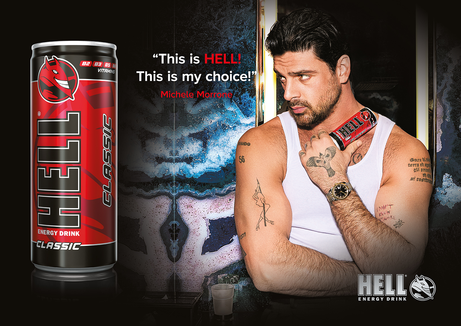 A partire dal 2024, il volto internazionale di HELL ENERGY è stato rappresentato dall’attore italiano Michele Morrone, simbolo dell’eleganza e della potenza che caratterizzano il brand.
