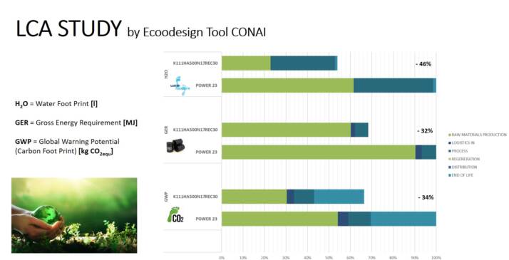 • migliore performance in termini di LCA (Life Cycle Assestment) grazie ad un risparmio di acqua del 46%, un risparmio di energia del 32% ed infine una diminuzione in termini di carbon Foot Print pari al 34%.