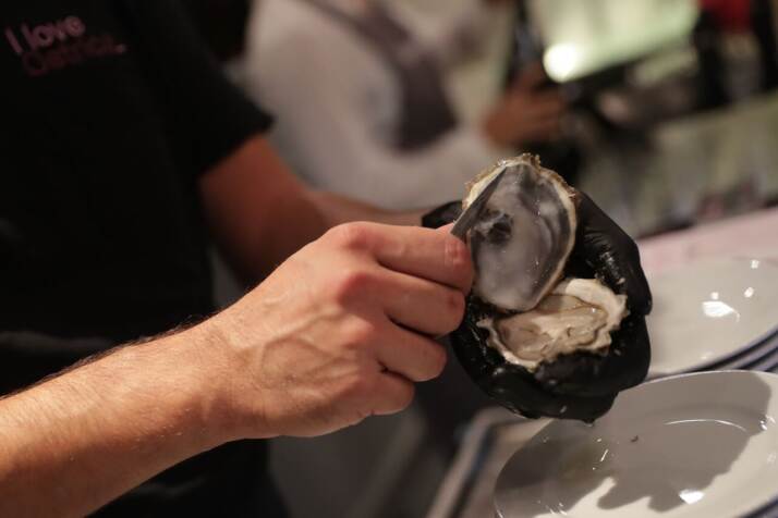 Occasione per presentare la special edition «Incontri Sapidi», le ostriche scelte sono state la Princesse de Setúbal, la Prestige Des Mers e la Fine de Claire. Ostriche selezionate (e nel caso di quest’ultima anche prodotte) da Cédric Roy de Lamaison, ostricoltore da quattro generazioni, tra i più grandi allevatori e selezionatori di ostriche, originario di La Tremblade, una delle capitali ostricole della Nouvelle Aquitaine, nei pressi di Bordeaux. Abbinamento a tre vini ottenuti da vigneti di proprietà di Cusumano in tre territori. Tenuta Ficuzza, all’interno del bosco di Ficuzza, a 700 metri sul livello del mare, Tenuta di Monte Pietroso, a 500 metri in prossimità del mare, il luogo ideale dove allevare un Grillo complesso ed elegante e Tenuta San Carlo, a Partinico, una zona che ha caratteristiche simili a quelle dove a metà dell’Ottocento si allevava il Moscato Bianco.