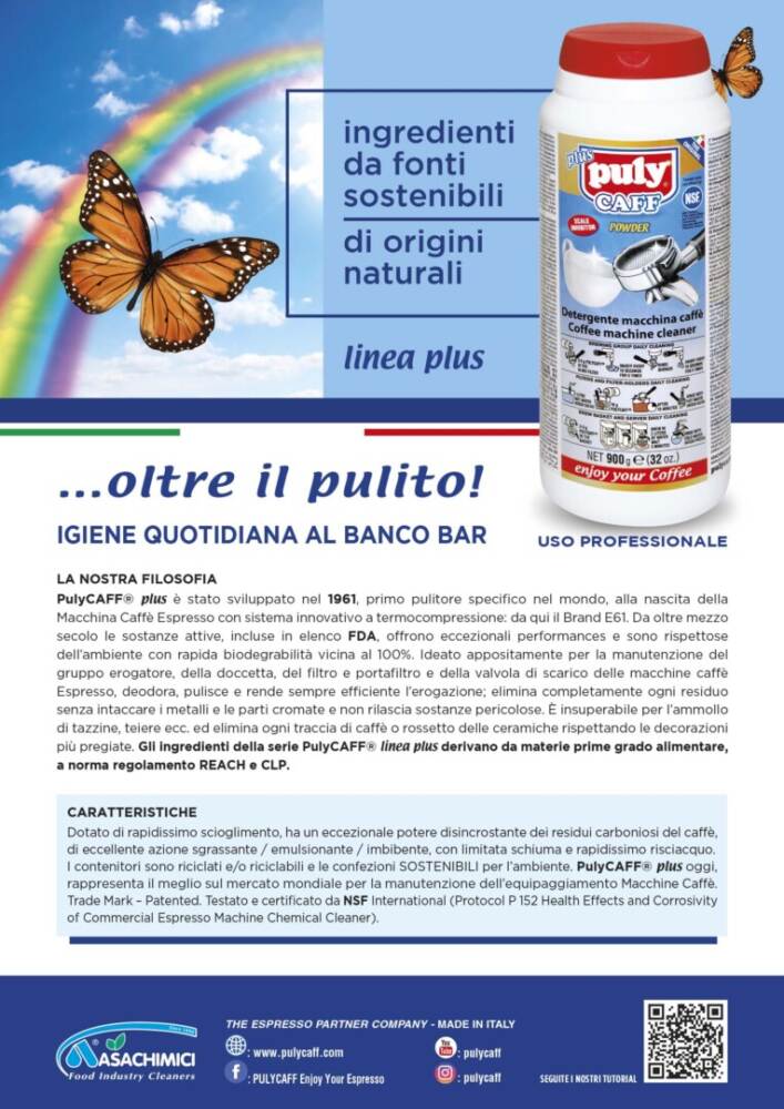 Dal 1961 pulyCAFF® è il pulitore specifico per la manutenzione della macchina espresso: elimina completamente ogni residuo da gruppo erogatore, doccetta, filtro, portafiltro e valvola di scarico. Non intacca i metalli e le parti cromate e non rilascia sostanze pericolose, dunque è più che mai amico delle apparecchiature, ma anche del barista e della qualità e salubrità degli espressi erogati. Per questo è presente nelle principali scuole di formazione e ogni giorno lo si trova all’opera in numerosissimi bar in Italia e nel mondo. Le sue sostanze attive sono incluse in elenco FDA – Food and Drug Administration, l’ente governativo statunitense che si occupa della regolamentazione dei prodotti alimentari e farmaceutici e ha come scopo la protezione della salute dei cittadini.