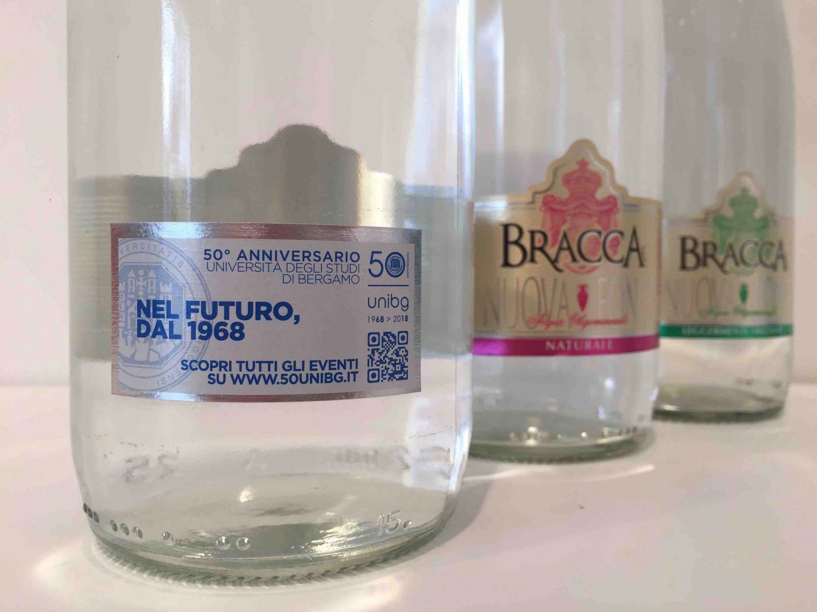 Quest’anno le aziende hanno deciso per il 50° anniversario dell’Università degli Studi di Bergamo di rivestire 4 milioni di bottiglie (2,5 milioni sulle bottiglie di acqua minerale Bracca e 1,5 milioni su quelle di acqua minerale Pineta), che saranno distribuite su tutto il territorio nazionale. Sulla retroetichetta, oltre allo stemma dell’ateneo e al logo delle celebrazioni del cinquantenario, sono riportati lo slogan “Nel futuro, dal 1968”, il sito internet che richiama agli eventi organizzati quest’anno e un QR Code per accedere direttamente al sito dell’ateneo.