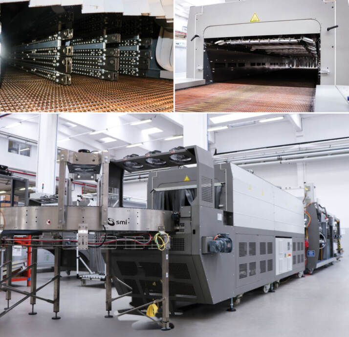 Nell’ambito delle soluzioni di packaging sostenibile, SMI realizza tunnel di termoretrazione della serie UHQ (Ultra High Quality), adatti per la realizzazione di pacchi in singola, doppia o tripla pista esteticamente perfetti e caratterizzati da elementi innovativi, in grado di ridurre la dispersione del calore e assicurare l’ottimale regolazione dei flussi d’aria.