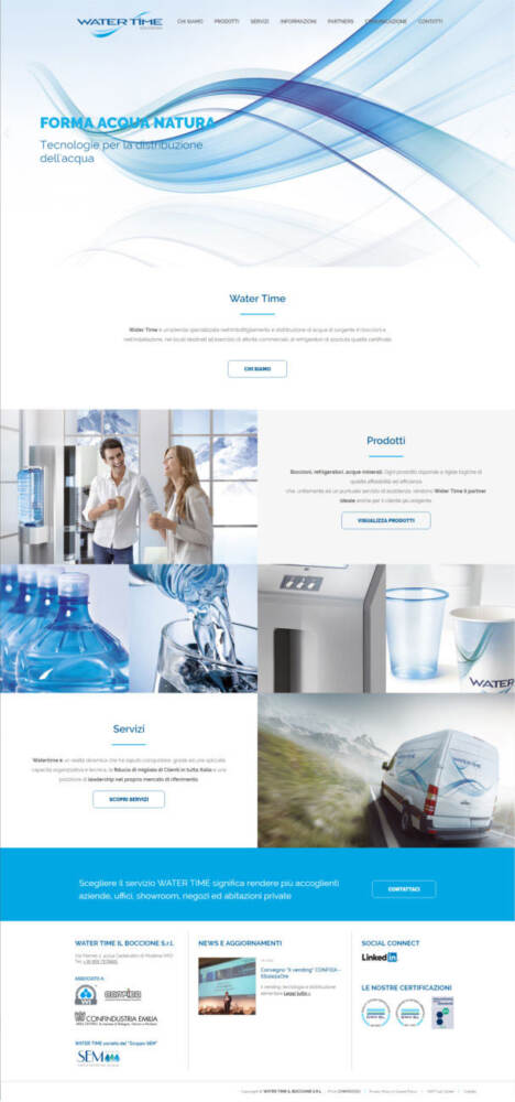 Il sito www.water-time.it è stato realizzato dall’agenzia Dataweb Service di Milano su un CMS Custom seguendo i canoni tecnologici più innovativi. Responsive e Google friendly, il sito consente una navigazione semplice da qualunque device, telefono o tablet. Curato nei contenuti, conferma l’attenzione di Water Time alle novità e agli aggiornamenti negli ambiti di interesse e rappresenta, con il logo e il nuovo materiale istituzionale, un passaggio significativo per valorizzare l’immagine dell’azienda.