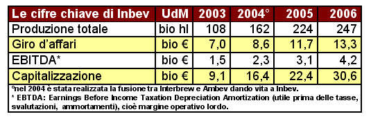 Risultati in forte progressione per la multinazionale belga-brasiliana che per il 2006 dichiara un volume di vendita complessivo di birre e altre bevande di 247 milioni di ettolitri, di cui 212 milioni di birre e 35 di bevande analcolche. Il fatturato totale è cresciuto di ben il 14% portandosi a 13,3 miliardi di euro. Infine sono fortemente migliorati i margini: il margine operativo (EBITDA) si è portato a 4, 2 miliardi di euro, pari a quasi il 32% del fatturato netto. In tal modo il management aziendale rafforza il proposito di far diventare l’Inbev la migliore impresa nel settore mondiale della birra, dopo essere diventata la più grande in termini di volumi.