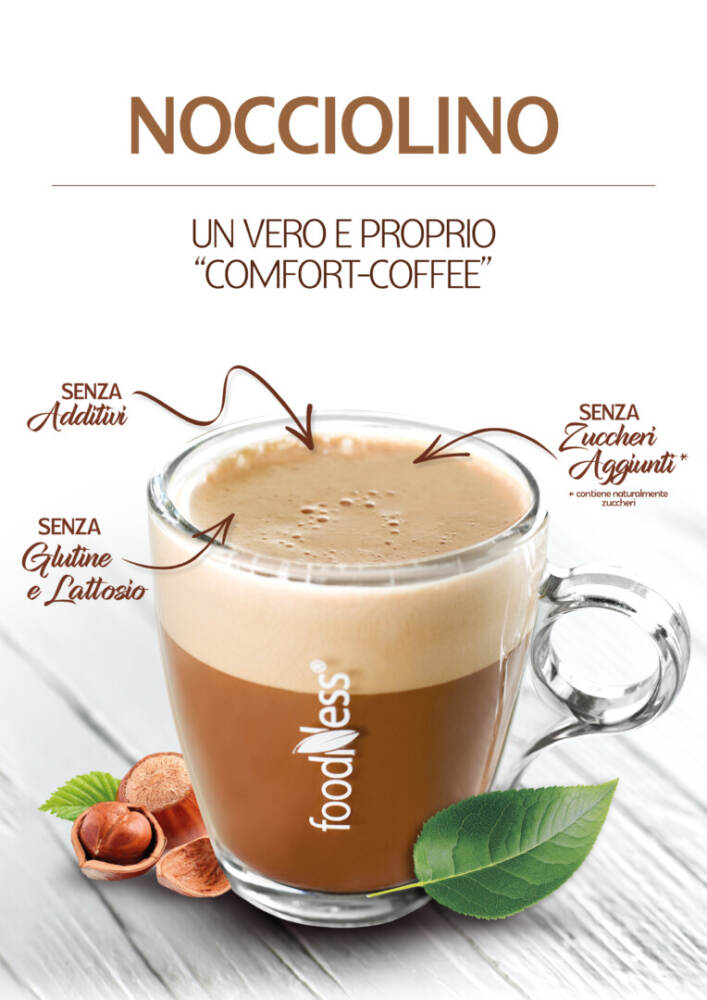 Foodness interpreta un classico della pausa al bar, Nocciolino, il caffè gourmet alla nocciola dall’aroma morbido e rotondo di nocciole tostate.