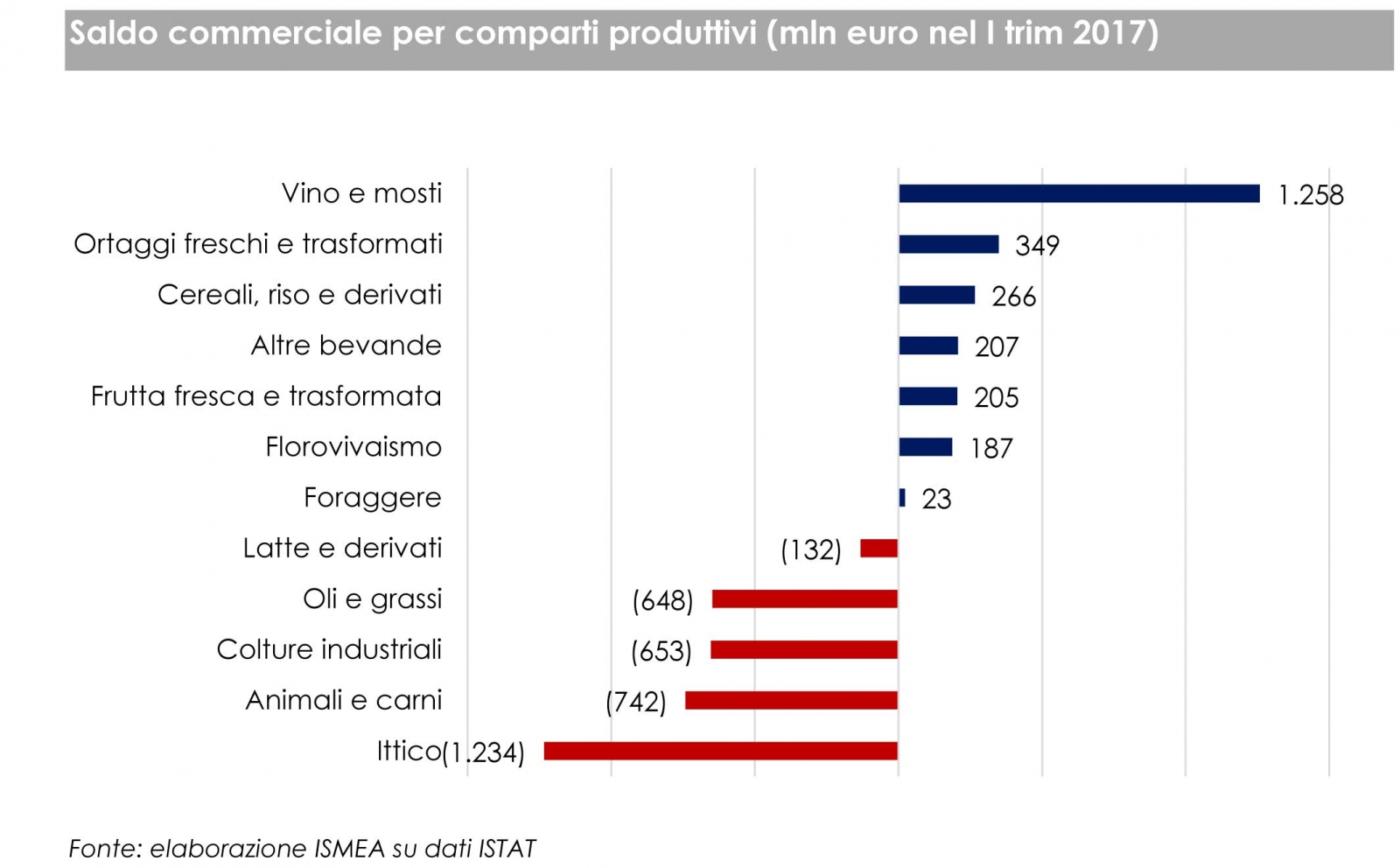 Con riferimento al saldo commerciale, considerando le due componenti del comparto, il miglioramento del saldo è da ricondurre all’industria alimentare, attestandosi a quota 286 milioni di euro, in crescita di 99 milioni di euro rispetto a quello registrato nel primo trimestre dello scorso anno. In peggioramento invece il deficit agricolo, che è aumentato di 20 milioni di euro.