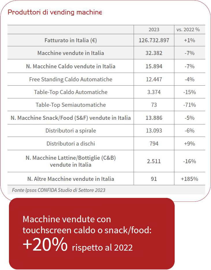 Il primato dell’Italia riguarda anche la fabbricazione di distributori automatici. Il nostro Paese è infatti il primo produttore mondiale di vending machine costruite in Italia ed esportate in tutto il mondo. Il 70% della produzione di distributori automatici viene esportato all’estero. Nel campo della distribuzione automatica, l’Italia è leader a livello internazionale. il nostro paese, infatti, ha la più ampia rete distributiva alimentare automatica d’Europa con 831 mila vending machine installate, seguito da Francia (638 mila), Germania (621 mila) e Inghilterra (406 mila).