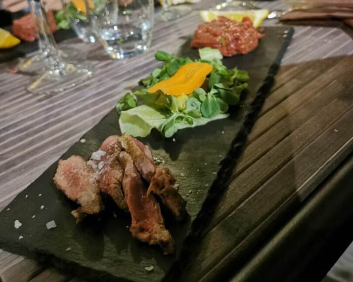 Il menù degustazione? Quattro portate e un dolce finale, il tutto accompagnato dal più congeniale calice di vino o da un cocktail realizzato proprio coi prodotti della prima distilleria artigianale della regione del Chianti Classico. Nello specifico, la sapidità della tartare di branzino e salmone marinato si è sposata dunque alla perfezione con la rinfrescante Bollicina Rosè Altadonna Orarosa, spumante rosè ottenuto da Sangiovese in purezza, dall’attraente color rosa e perlage fine e persistente, con aromi floreali e di piccoli frutti rossi e, al palato, un gusto intenso, con note ben definite di fragoline di bosco, ciliegia e pompelmo rosa. Lo step successivo è stato il pairing tra la tartare di scottona alla francese e la ricercatissima tagliata di pluma iberica, la cui burrosità si è congiunta in equilibrio con un vino rosso fresco, fruttato, floreale e con piccole note speziate quale il Chianti Classico DOCG Altadonna, ottenuto dal blend tra Sangiovese 90% e Merlot 10%, con un gusto pieno, ampio e corposo, oltre a piacevoli tannini. Infine, ecco l’accostamento più audace: quello tra il maialetto in agrodolce Kakuni (tipico piatto della tradizione culinaria giapponese) e l’IGT Assalto Altadonna, dal blend tra Sangiovese 70%, Cabernet Sauvignon 15% e Merlot 15%: un vino complesso al naso, ricco, elegante e persistente, con sentori di frutta rossa, ribes, ribes nero, mirtillo e bacche nere, impreziosito da lunghe note speziate, fresche e dolci in grado di dare tanta continuità quanto bilanciamento alla forza agrodolce sprigionata dal suo rispettivo piatto.