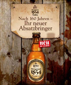 Nel 2014 Licher festeggia il 160° anniversario – la fabbricazione originaria della birra nel Hardtberggarten a Lich è stata fondata nel 1854 da Johann Heinrich Ihring. La birra “Licher Original 1854 Naturtrüb”, disponibile da tre anni nella gastronomia, i consumatori la trovano da gennaio di questo anno anche in bottiglia 0,33-l VAR – nella bottiglia speciale con una etichetta che pretende essere antica. La birra viene preparata secondo una ricetta originale: senza essere filtrata, che si beve bene e dal gusto pieno. “Già nel primo mese dell’anno la domanda del “1854” è stata più che superata. In lettere, Facebook e nelle visite alla fabbricazione della birra i fan Licher lodano il nuovo prodotto. Questa risonanza eminente ha sorpreso persino noi”. Per festeggiare debitamente l’anniversario questo anno, Licher il 30 e il 31 agosto prepara una grande festa della fabbricazione della birra per la prima volta sul terreno nel Hardtberggarten. “Così noi mostriamo il nostro attaccamento alla regione, in cui le birre Licher dal 1854 hanno la loro patria”. “Noi vogliamo far rivivere queste birre Licher e mostrare dove è di casa il numero uno della marca della birra dell’Assia.” Fra l’altro c’è in progetto una manifestazione musicale, una grande birreria all’aperto nonché visite attraverso i capannoni di produzione. Il programma completo viene presentato nel corso dell’anno.