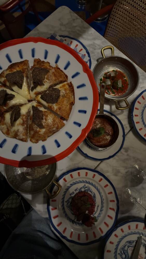 Un altro piatto da non perdere è la Battuta di Manzo con Tartufo nero di Bagnoli Irpino, un abbinamento perfetto tra la carne di alta qualità e il profumo intenso del tartufo. Infine, la Pizza al Padellino con Tartufo è stata un’inaspettata sorpresa, che ci ha trasportato in un viaggio sensoriale. Il tutto accompagnato con un ottimo Capranera Aglianico.