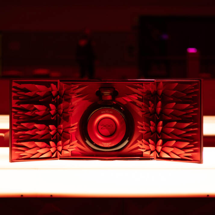 Sono stati prodotti solo 200 esemplari di TIME : SPACE, uno per ogni anno di vita della distilleria, incastonati in una scultura lavorata a mano di quercia americana ed europea, progettata appositamente per accentuare il colore naturale al 100% del whisky. Nel suo complesso questa opera d’arte simboleggia l’impegno di Macallan a proteggere e coltivare questo mestiere per il futuro e al tempo stesso l’intima connessione circolare tra passato e futuro. 200 punte che riecheggiano l’arte degli origami adornano la scultura, mimando il modo in cui la natura custodisce ciò che è più prezioso e fragile. Allo stesso modo questo intricato gioco di spigoli serve a proteggere ciò che è più prezioso per Macallan, il suo incomparabile whisky.