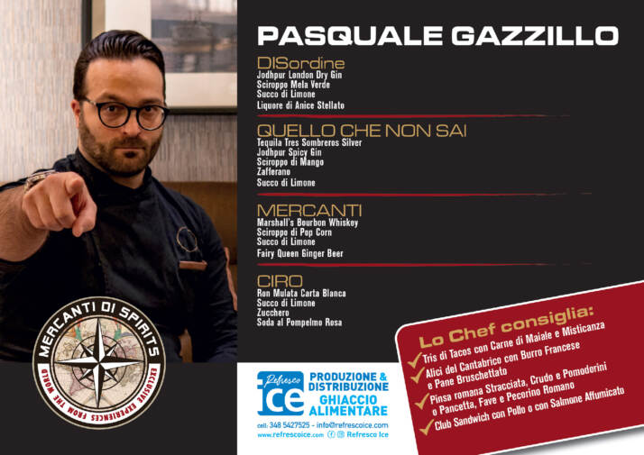 Anche Pasquale Gazzillo proporrà ben 4 cocktail originali. DISordine a base di Jodhpur London Dry Gin, Quello che non sai a basedi Tequila Tres Sombreros Silver e Jodhpur Spicy, Mercanti a base di Marshall’s Bourbon Whiskey e Ciro a base di Ron Mulata Carta Blanca.