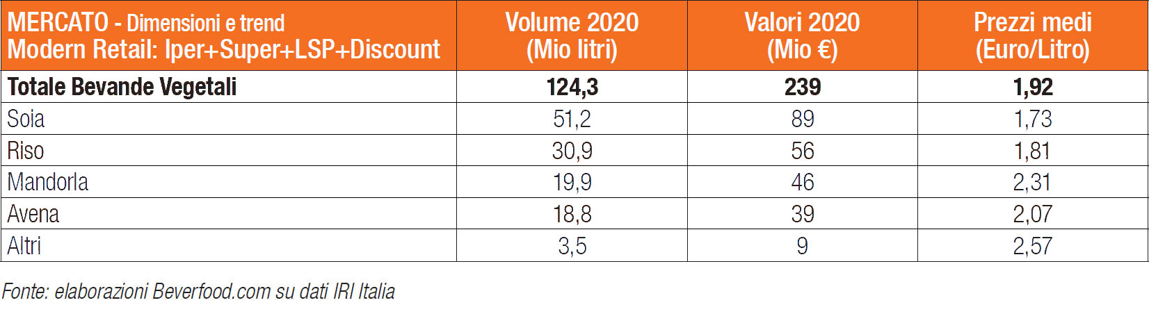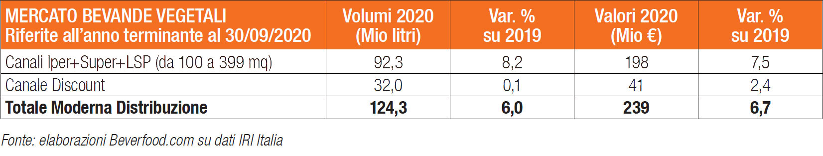 Secondo gli ultimi dati di IRI Italia, le vendite di bevande vegetali nella Distribuzione Moderna sono ammontate  nell’ultimo  anno a oltre 124 milioni di litri, di cui 92 milioni (+8,2%) nei canali Iper – Super – LSP e 32 milioni (+0,1%) nel canale Discount, per un valore complessivo di 239 milioni  di  €.  Nell’ambito della Distribuzione Moderna il canale prevalente è quello dei supermercati (55% a quantità e 61% a valore), seguito dal canale Discount (26% a quantità e 17% a valore).