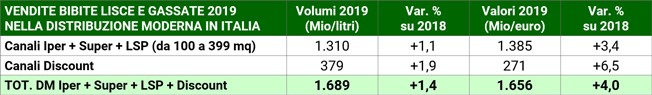 Il mercato delle bibite (lisce e gassate) in Italia ha sofferto un trend negativo negli ultimi anni, ma nel corso del 2019, almeno con riguardo alle vendite nei canali della distribuzione moderna, il mercato ha chiuso in positivo sia in termini di volumi che in termini di valore.