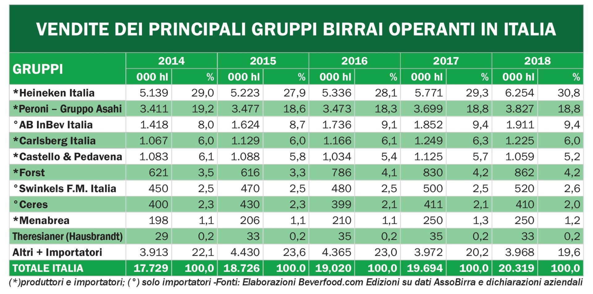 Sul mercato italiano delle birre operano dieci società birrarie con produzione industriale sul nostro territorio: Heineken Italia, Birra Peroni, Birra Castello, Carlsberg Italia, Forst, Menabrea, l’emergente Birra Morena e poi altre tre aziende di più piccola dimensione (Theresianer, Semedorato, Birrificio Messina). Esse gestiscono complessivamente 16 stabilimenti di produzione, ubicati in diverse regioni del Nord e Sud Italia.