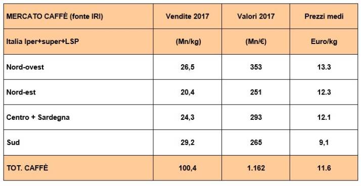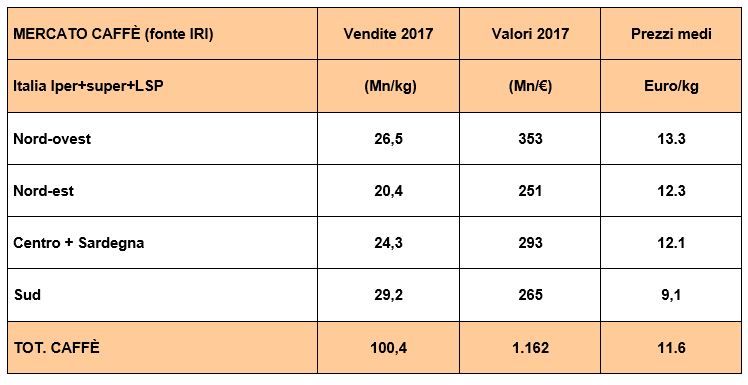 La ripartizione delle vendite a quantità è abbastanza equilibrata tra le varie aree geografiche, segno che il consumo di caffè è diffuso in maniera alquanto omogenea tra le varie regioni. Tuttavia nel centro-nord si riescono a lucrare prezzi medi più alti rispetto al sud. Questa forte diversificazione dei prezzi medi è presumibilmente collegata ad un differente livello di consumo del caffè porzionato tra le varie aree geografiche.