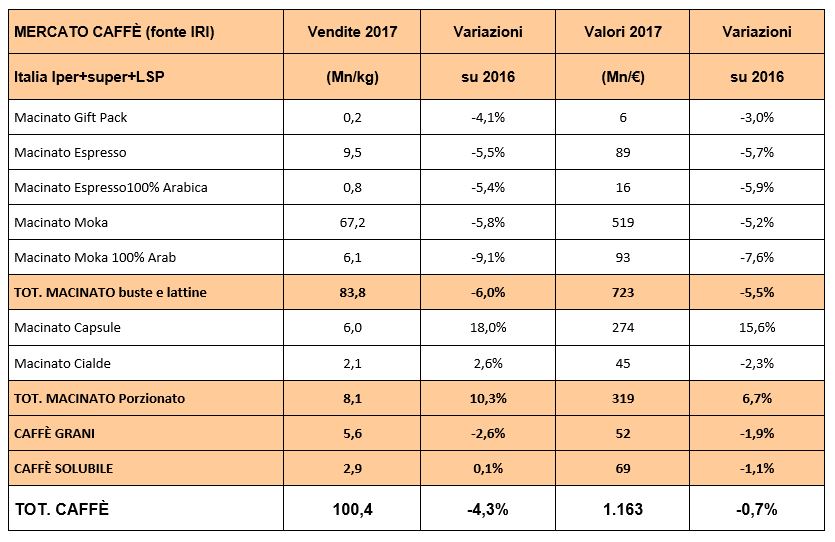 Con specifico riguardo ai canali iper + super + LSD, anche per l’annata 2017 i dati IRI indicano un deciso calo di volumi del 4,3% (che si sono ora portati a poco più di 100 mio kg), mentre a valore il calo viene contenuto al di sotto  dell’1%  (valori pari a 1.116 mio euro). Va segnalato che il calo dei volumi di vendita nella GDO è in atto da diversi anni. Probabilmente i punti di vendita del moderno dettaglio stanno soffrendo la concorrenza delle vendite on-line e dei negozi specializzati (Boutiques e Coffee Store) in continuo sviluppo su tutto il territorio nazionale, soprattutto con riferimento al segmento del caffè in cialde e capsule.