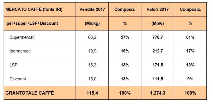 Anche per il canale discount il trend delle vendite 2017 mette in evidenza un deciso calo dei volumi e il mantenimento sostanziale dei valori. Da segnalare per questo canale una maggiore incidenza del caffè in grani pari ad oltre il 13% a volume, con dei prezzi euro/kg particolarmente bassi (solo 4,6 euro/kg). Sommando i volumi ed i valori tra i vari canali, perveniamo ad una stima complessiva del dettaglio moderno (iper + super + LSP + discount) di 115, 4 mio/kg e 1274 Mio/euro, con la seguente ripartizione tra i vari sotto-canali: