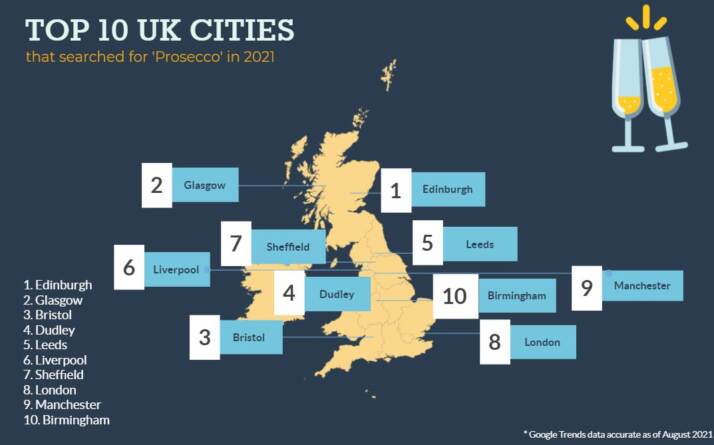 Negli ultimi 12 mesi, la Scozia ha avuto il più alto interesse per la bevanda alcolica frizzante preferita da tutti, con l’Inghilterra che è arrivata al secondo posto nella classifica nazionale e il Galles che ha preferito la bevanda meno.