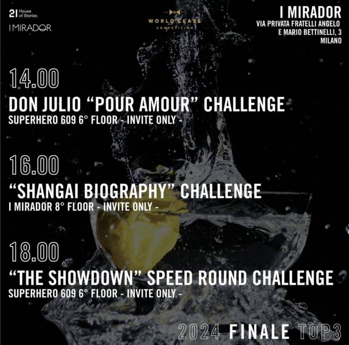 - 1° PROVA: POUR AMOUR – CREATIVE CHALLENGE si terrà presso SUPERHERO 609 alle ore 14:00. Don Julio è devota all’amore per i concetti di Craft, Community e Land tramandati dal Maestro Don Julio Gonzales. Il challenge consiste nel creare 2 Cocktails a base Don Julio che rappresenti una lettera d’amore diretta a qualsiasi individuo del Globo e non; ma anche un cocktail che rifletta e rispetta la terra, intesa come natura che ci circonda.