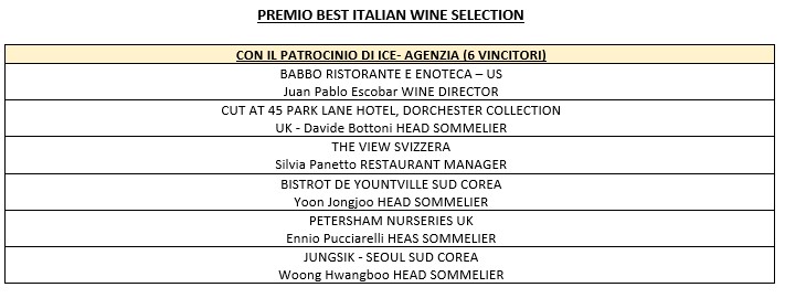 Oltre a celebrare le eccellenze enologiche del Belpaese, la giuria di Milano Wine Week – con il patrocinio di ICE – Agenzia – premia anche le migliori selezioni vinicole italiane presenti nelle carte dei vini di una rosa di realtà internazionali: luoghi che, attraverso la proposta vinicola, si fanno ambasciatori della cultura enogastronomica italiana nel mondo.