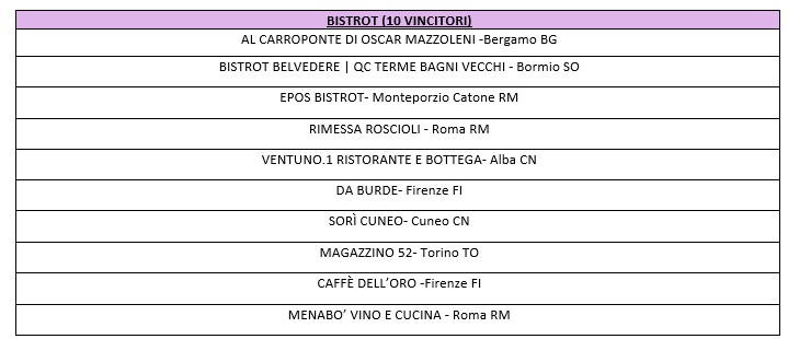 I riconoscimenti sono stati assegnati da una rinomata giuria di esperti presieduta dal Direttore della Guida Espresso Ristoranti, Critico e Gastronomo Andrea Grignaffini, e composta da giornalisti e professionisti del settore: Raffaele Cumani, Andrea Cuomo, Ciro Fontanesi, Elio Ghisalberti, Fabiano Guatteri, Andrea Guolo, Lara Loreti, Alberto Schieppati, Luca Turner e Orazio Vagnozzi.
