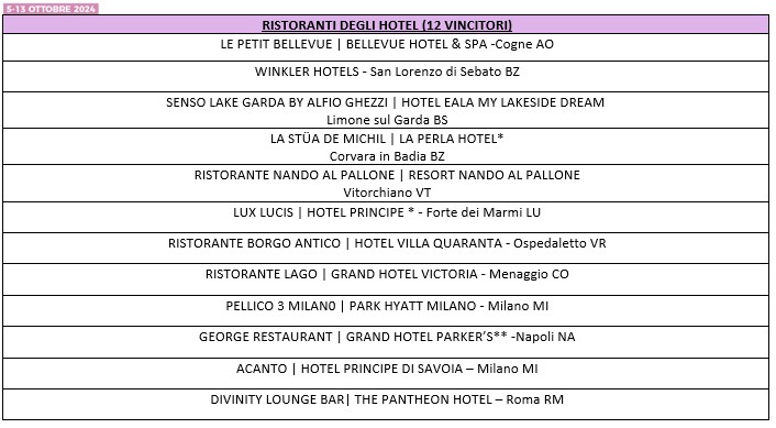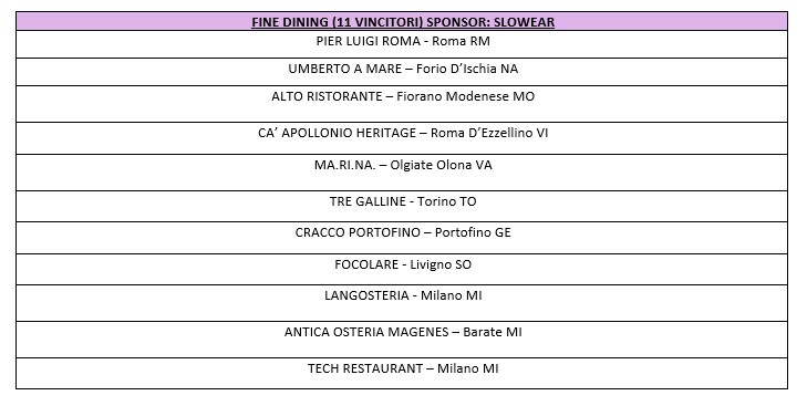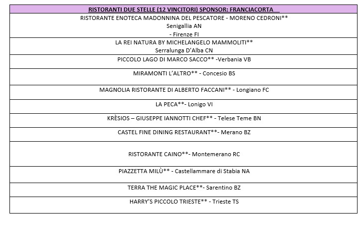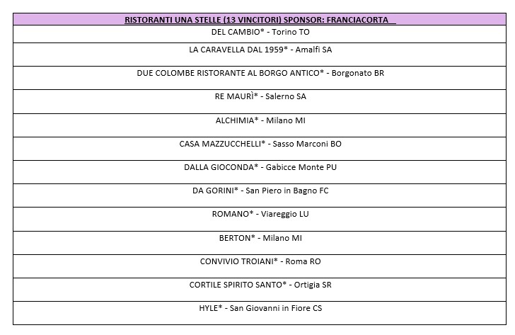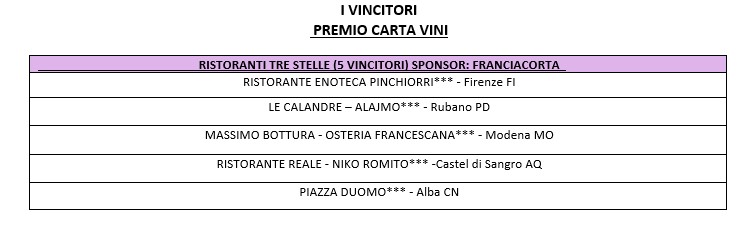 Una selezione delle migliori carte dei vini italiani, suddivisa in 10 categorie, premia 10 vincitori per ciascuna, per un totale di 100 riconoscimenti. La novità è che quest’anno le categorie ‘Stellate’ sono sponsorizzate da Franciacorta, mentre la categoria ‘Ristoranti d’Hotel’ è supportata da La Versa.