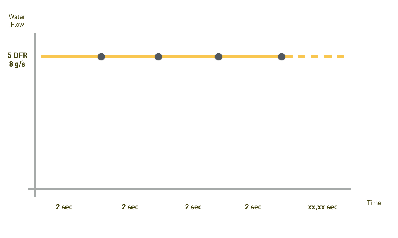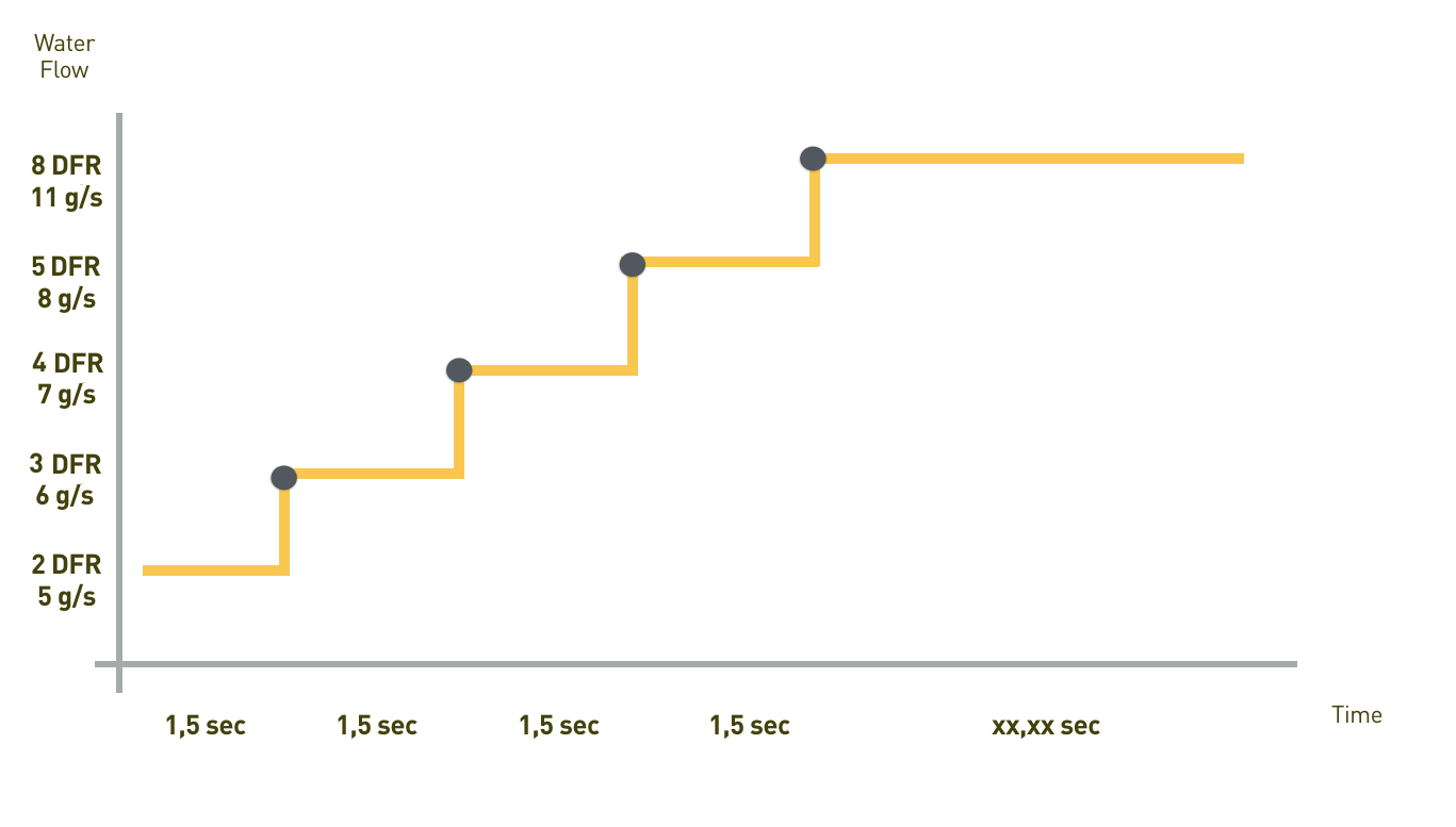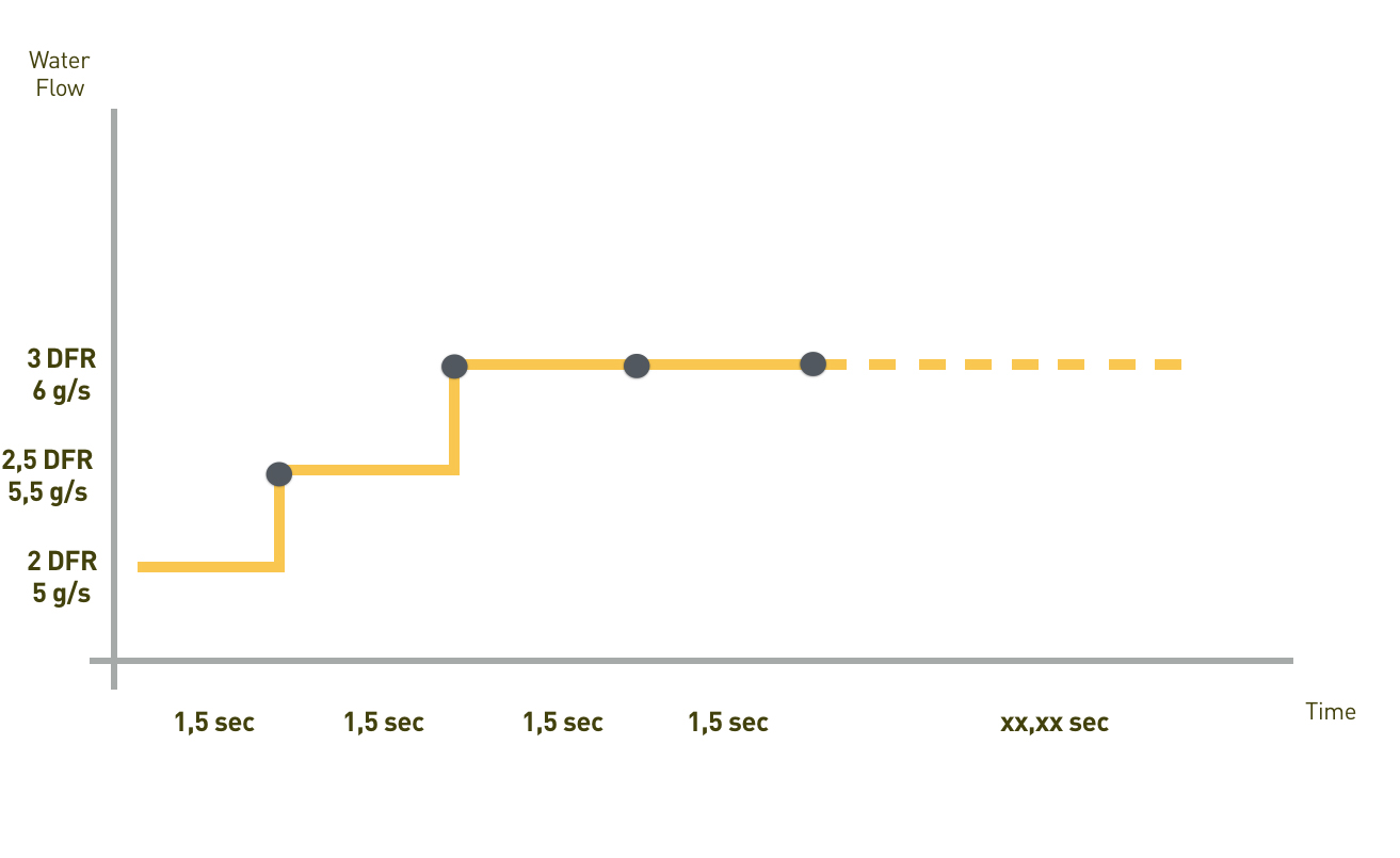 In the third profile, Danilo maintained a very gentle water flow on the coffee cake over the entire extraction, by slightly increasing the 2 initial steps and maintaining the flow constant up to the end of the extraction.