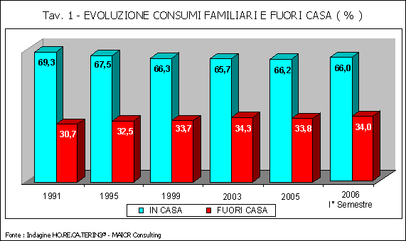 La società di consulenza MAIOR Consulting ha da poco completato la III° edizione biennale dell’Indagine HO.RE.CA.TERING 2006, che analizza in modo completo ed approfondito tutto il mercato del “fuori casa” in Italia. I dati evolutivi fondamentali sono evidenziati in tabella