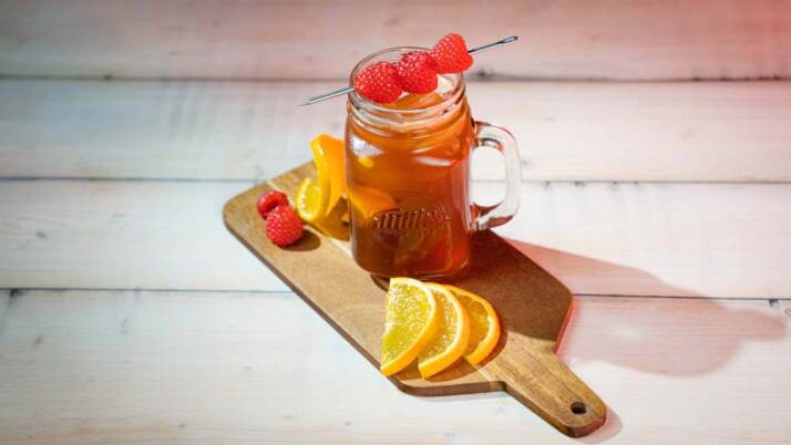 • Aggiungere ghiaccio nel bicchiere e guarnire con la frutta desiderata